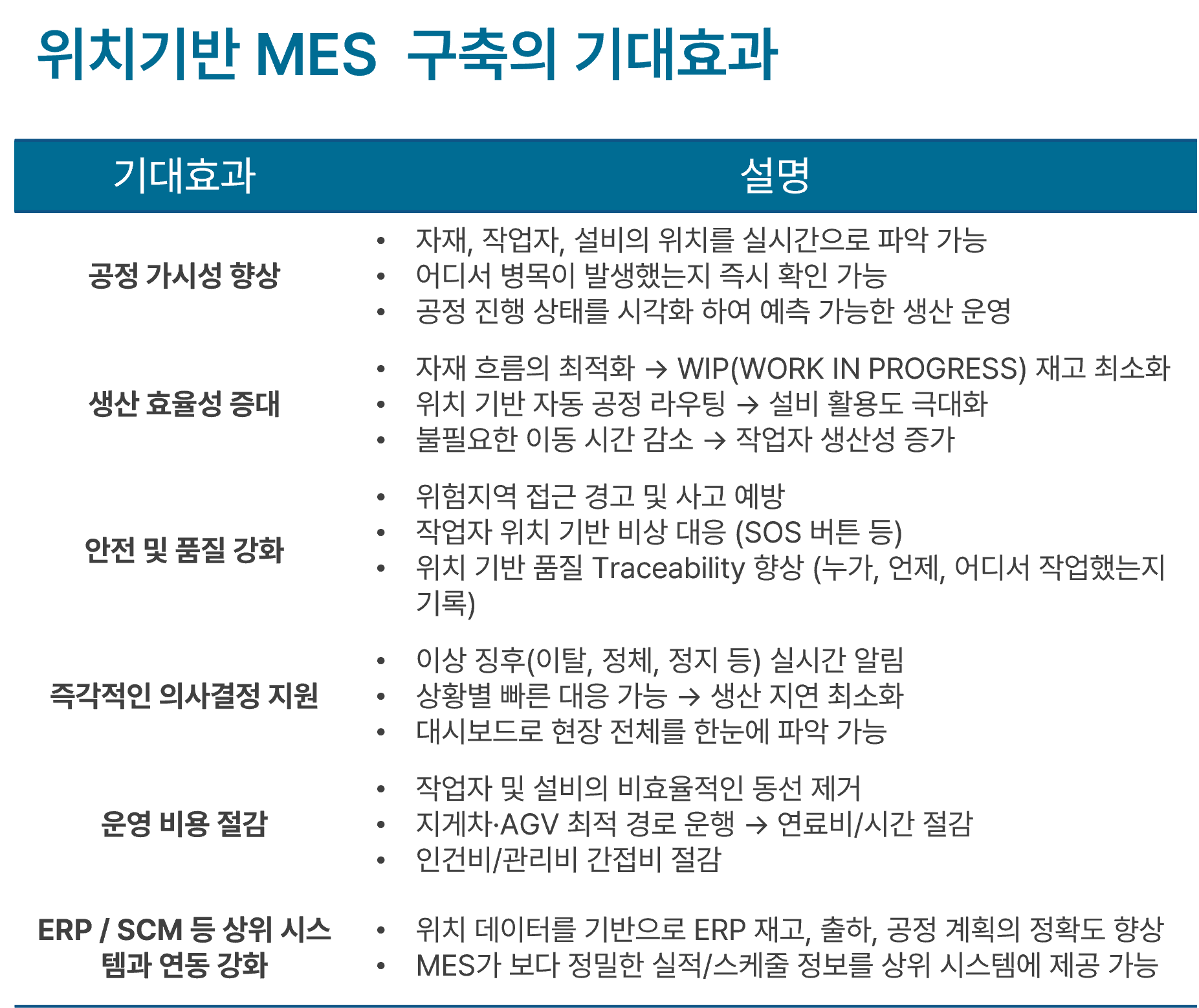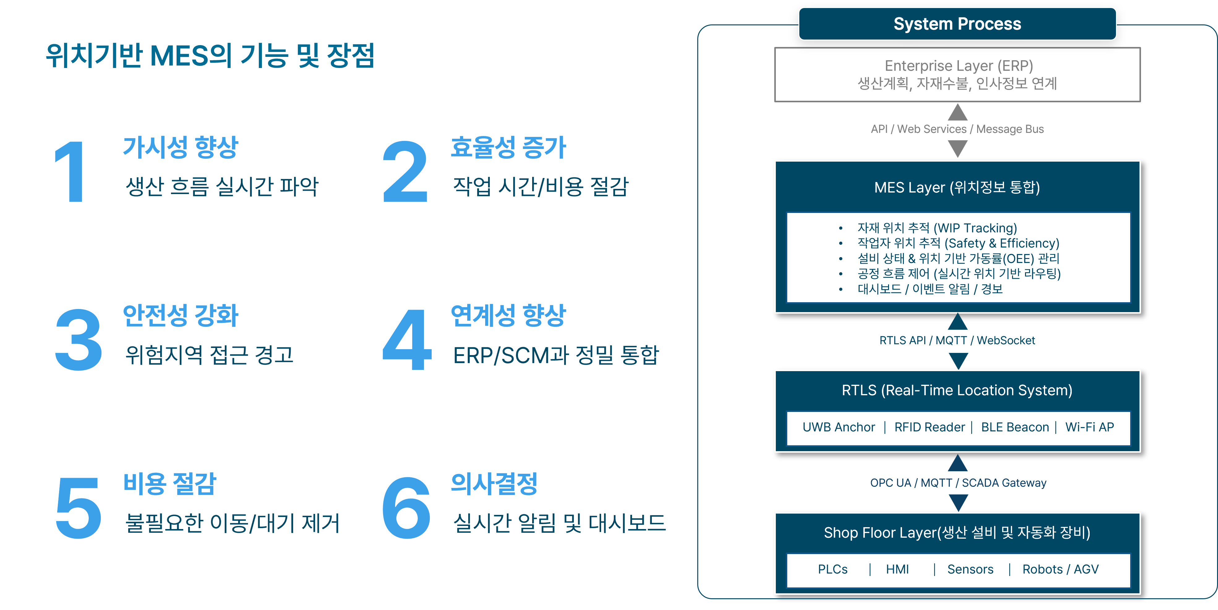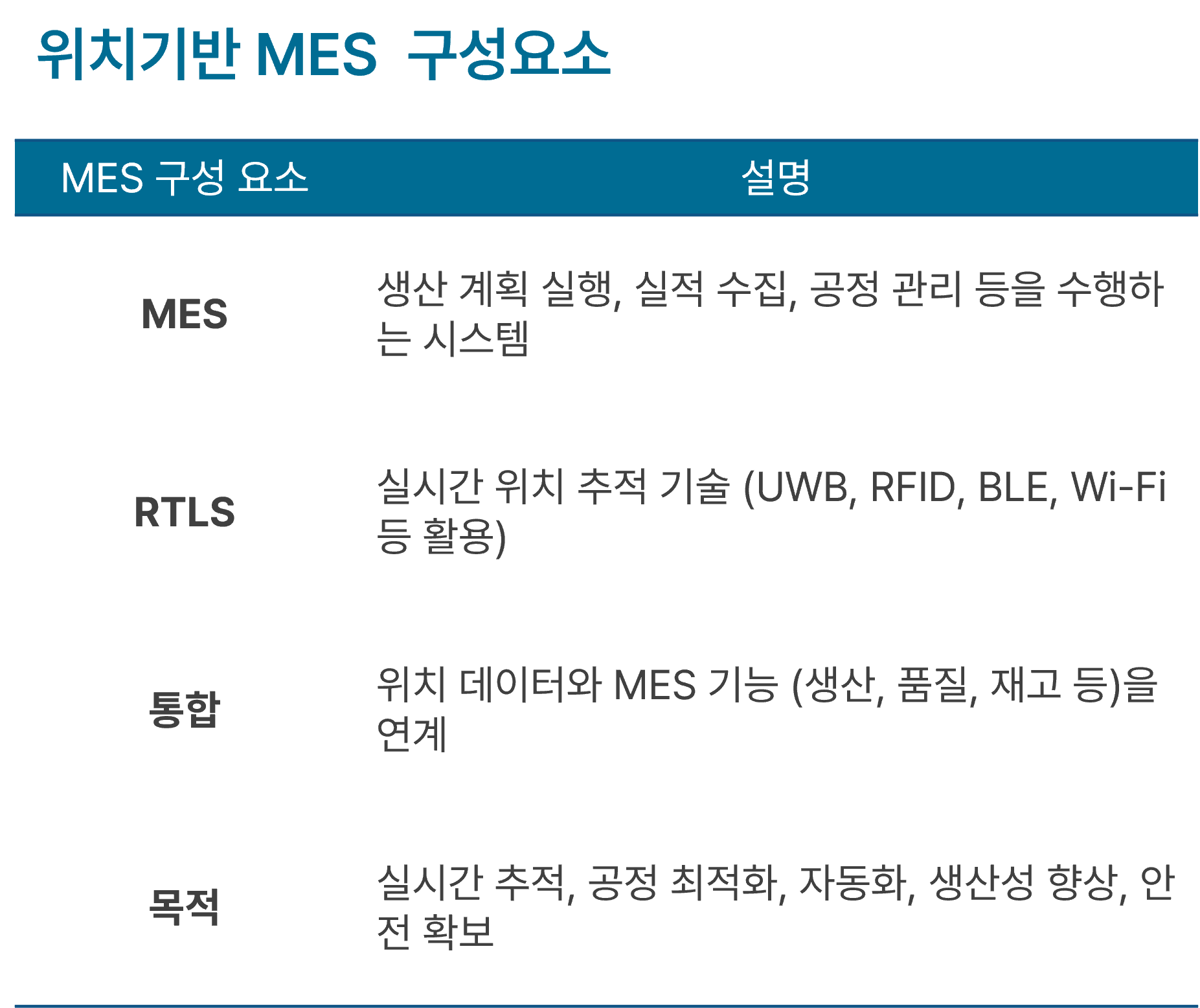 실시간 위치 기반 MES는 생산 현장의 자재, 작업자, 설비, 운송 장비 등의 위치 정보를 실시간(RTLS: Real-Time Location System) 으로 수집하여, 이를 제조 실행 시스템(MES)에 통합함으로써 공정 가시성, 생산 효율성, 품질, 안전성을 향상시키는 스마트 제조 시스템입니다.