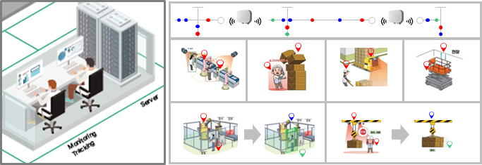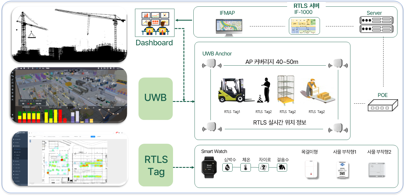 - 다양한 RTLS 하드웨어를 활용한 환경에 가장 적합한 Tag를 활용하여 작업자의 건강상태 및 차량의 정보/동선 실시간 시각화
