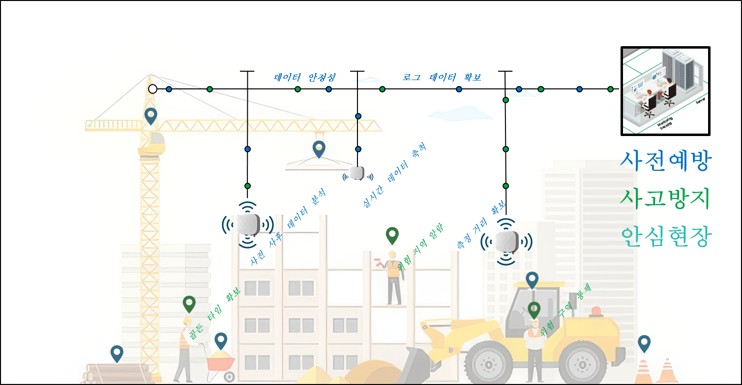 건설현장내 작업자와 장비에 부착된 스마트태그로 부터 데이터를 수신하고, 관제센터에서 실시간으로 위험사항과 안전을 통제 합니다.